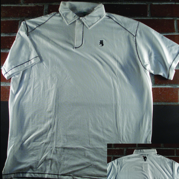 highest quality pima cotton/spandex/polyester blend for non-restrictive comfort and moisture wicking capability. 2 button front, self collar with contrast stitching along seams. embroidered LH monogram and hazard skull.