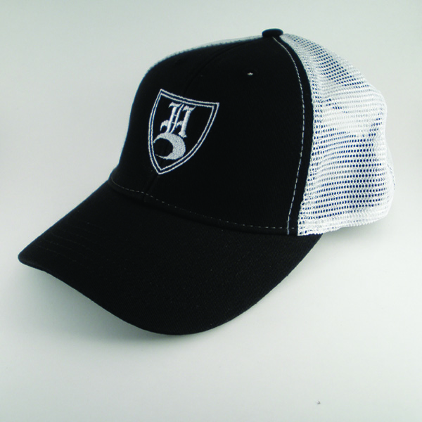 biowashed trucker cap black with white contrast stitching and embroidered LH shield in white. 55% cotton 45% polyester mesh curve billed golf cap.