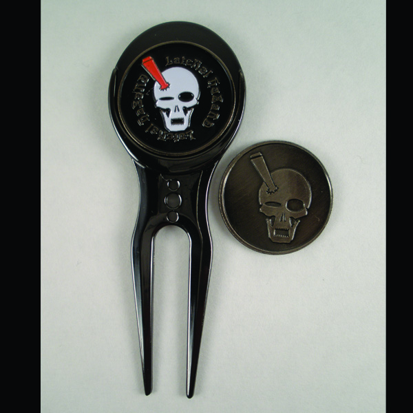 JUST ARRIVED!!! custom made lateral hazard ballmarker now available fore play. hazard skull symbol on black front. embossed hazard skull back. available with slick divot tool in hematite black or antique nickel. our uniquely original ballmarker is not available anywhere except through our online store.