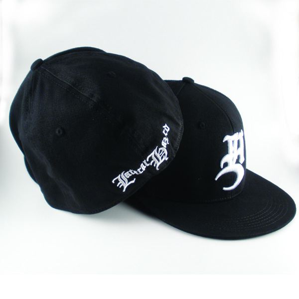 OUR MOST POPULAR FLAT BILL FITTED CAP. Lateral Hazard Monogram 3D white embroidery on black cap. Lateral Hazard embroidered white in back.